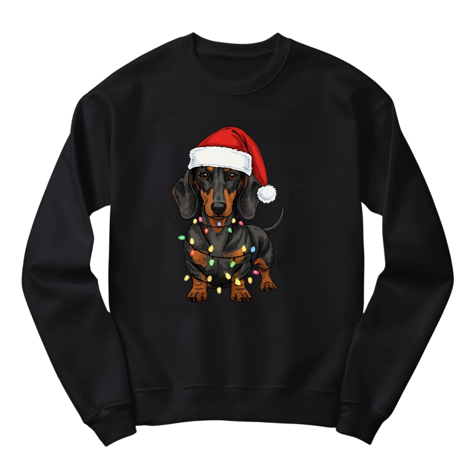 Bring the festive cheer with this adorable sausage dog Christmas jumper! Featuring a dachshund in a Santa hat wrapped in colourful fairy lights, it’s perfect for Christmas walks, cosy evenings, or as a fun gift for any dachshund lover.